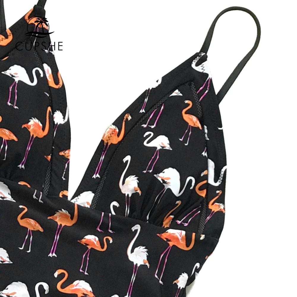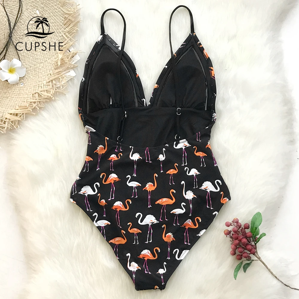 CUPSHE Flamingo Free To Fly Print One-piece Swimsuit Women Deep V neck Back Cutout Bodysuit Monokini 2019 Girl Sexy Swimwear